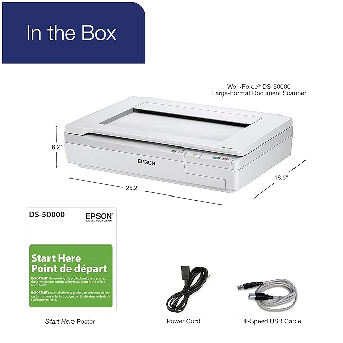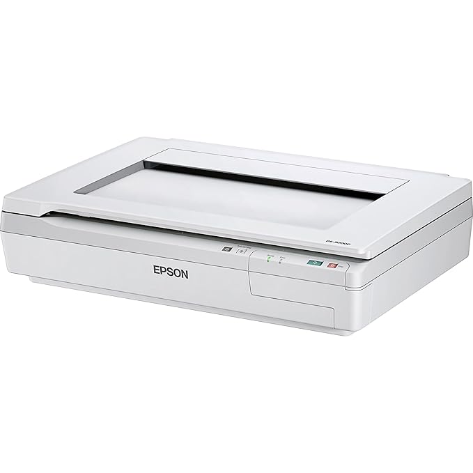 The Epson WorkForce DS-50000 (B11B204121) is a large-format A3 sheet-fed color scanner, offering 600 DPI high-resolution scanning for digitizing documents, graphics, and drawings. It features USB and network connectivity for smooth integration and comes with file management software to streamline workflows, making it ideal for professional use.
