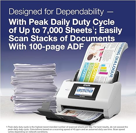 Designed for dependability — robust design with a peak daily duty cycle of up to 7,000 sheets2; easily scan stacks of documents with 100-page ADF.