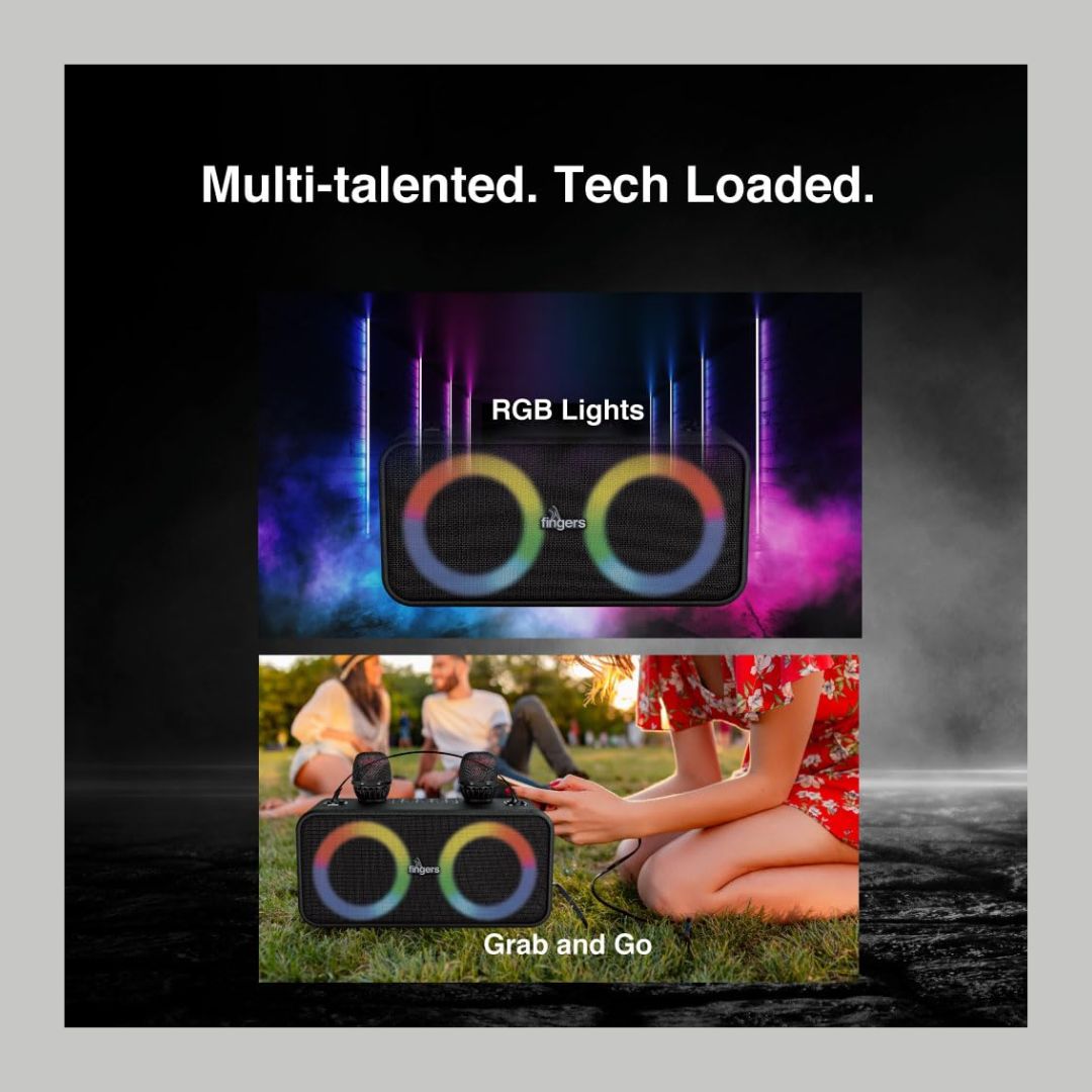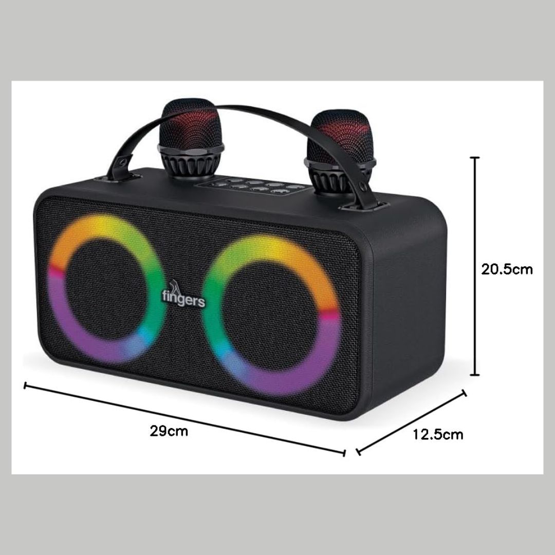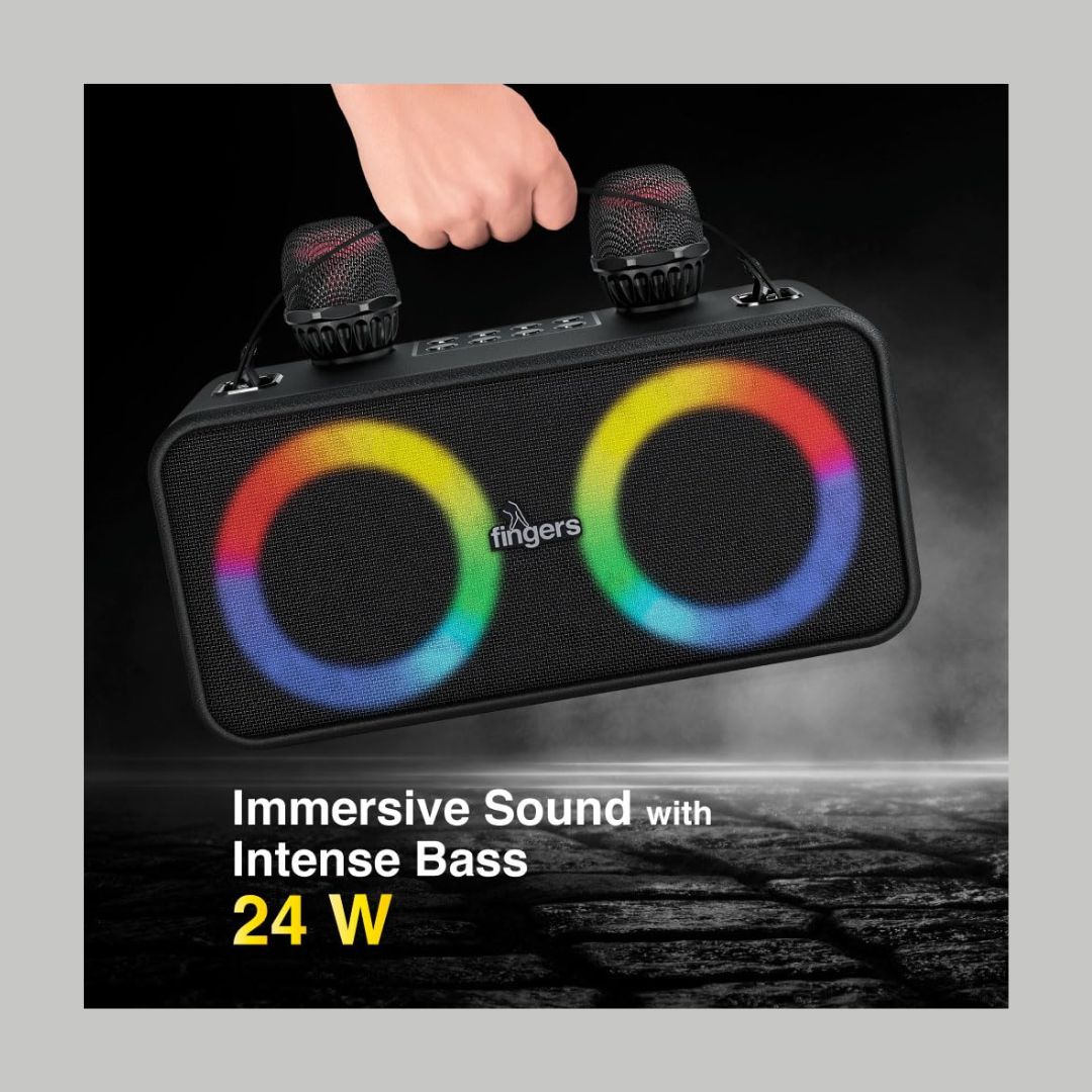 Bring the party home with the FINGERS 2Mic-Karaoke Portable Speaker, engineered for high-energy karaoke and music sessions. With a powerful 24W sound output and intense bass, this speaker delivers rich, room-filling audio that keeps the excitement alive.