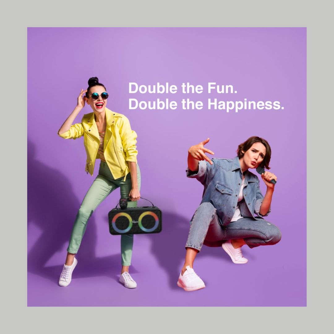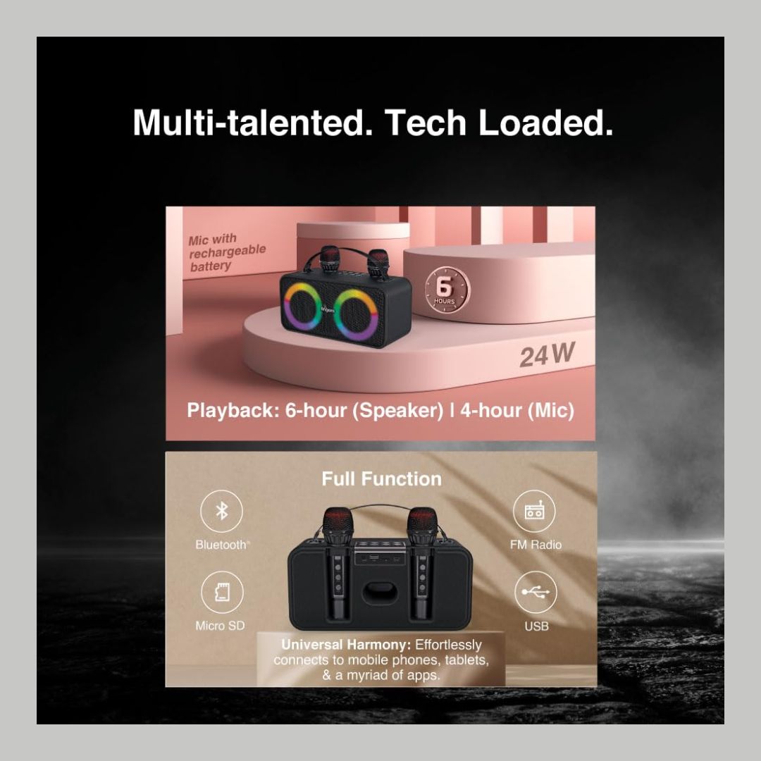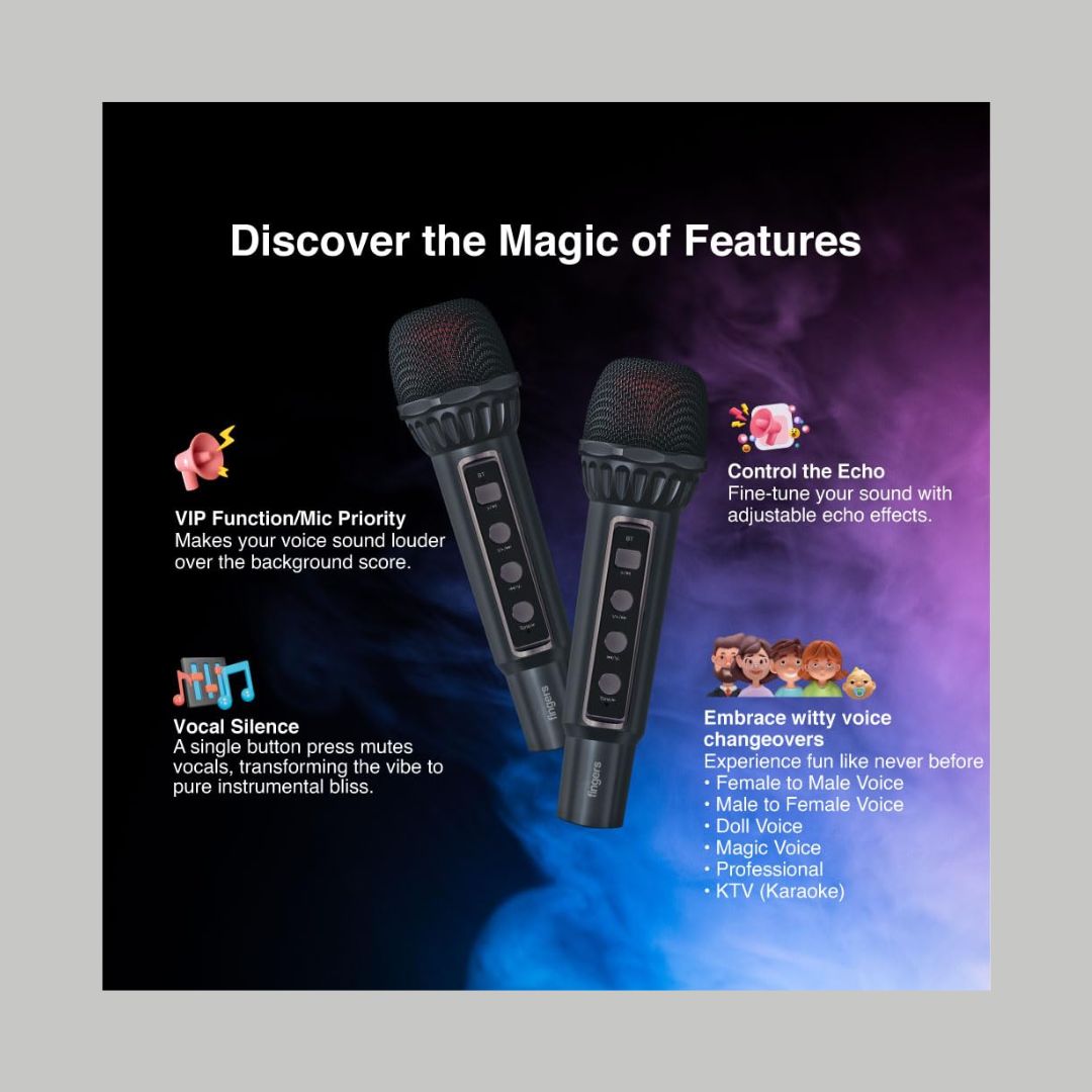 Bring the party home with the FINGERS 2Mic-Karaoke Portable Speaker, engineered for high-energy karaoke and music sessions. With a powerful 24W sound output and intense bass, this speaker delivers rich, room-filling audio that keeps the excitement alive.