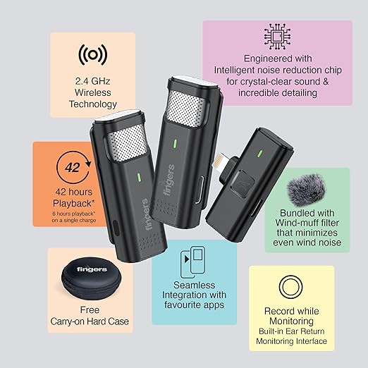 | Box Contents | 1 x Brand Note, 1 x FINGERS Duo-PhoneMic-Lightning (2 x Mics + 1 x Receiver + Charging Dock with Type-C), 1 x USB Type-C cable, 2 x Wind-muff Filter |