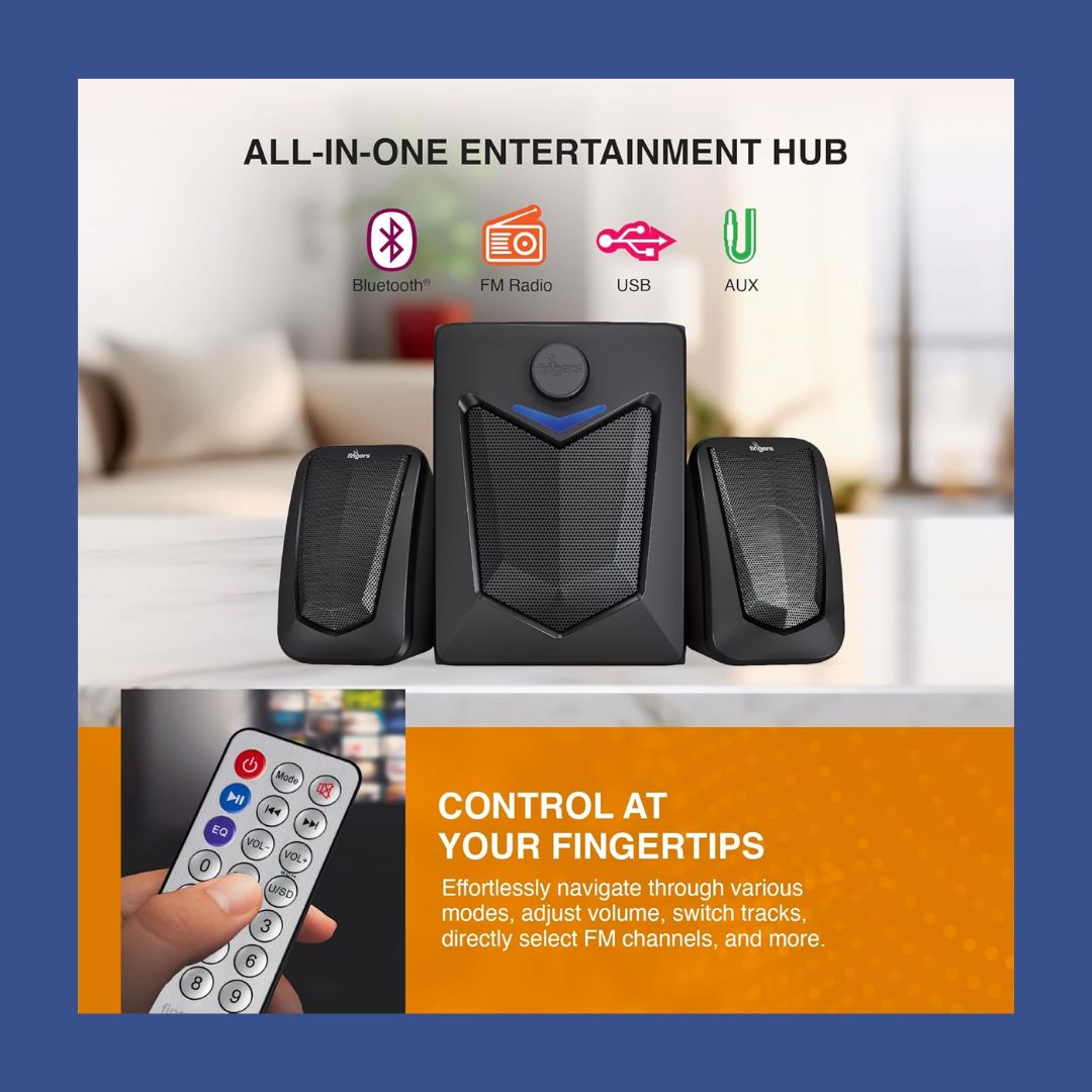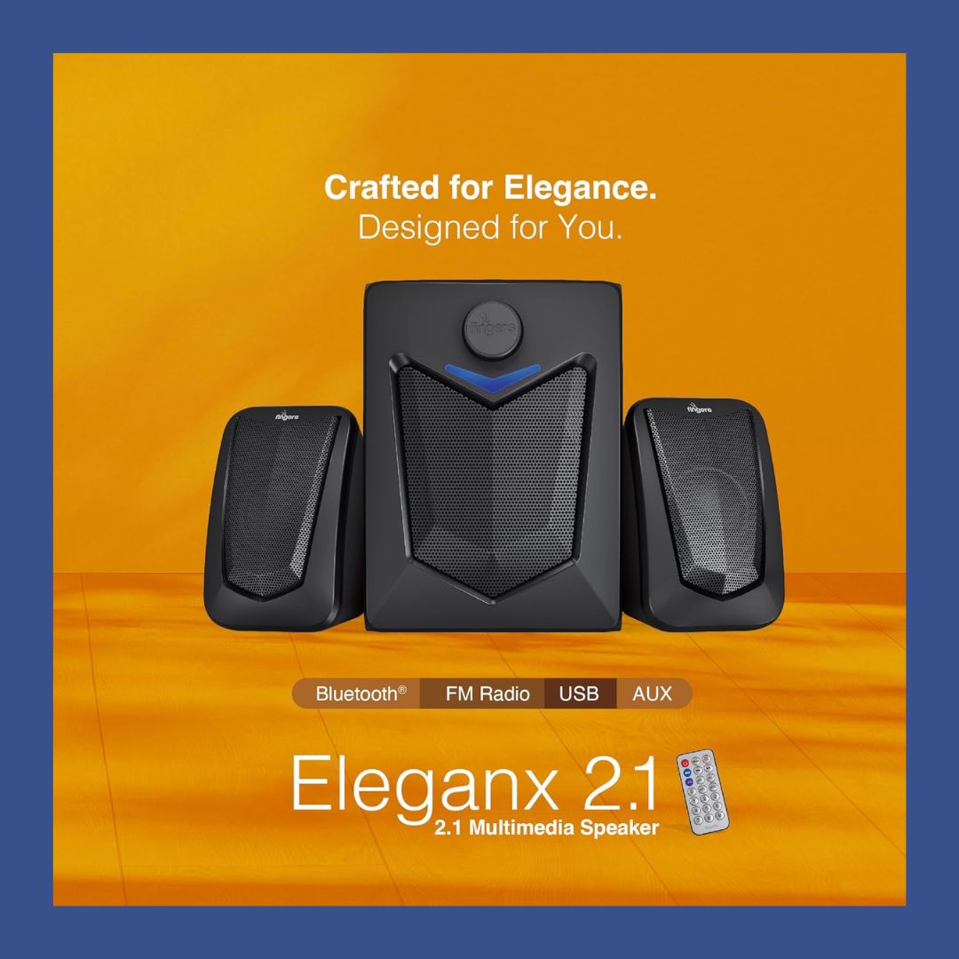 With a 15W output and 2.1 channel configuration, Eleganx provides balanced sound performance for home and desktop use. Enjoy wireless streaming via Bluetooth, connect through AUX or USB, or tune into your favourite stations using the built-in FM radio.