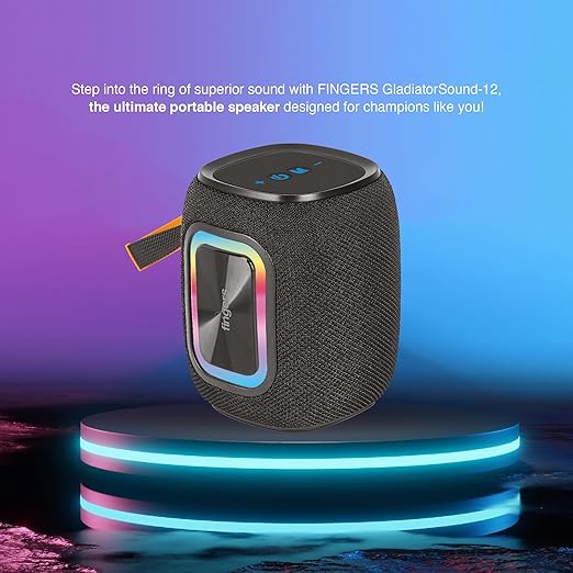 The FINGERS GladiatorSound-12 Portable Speaker delivers 12W powerful bass, crystal-clear sound, vibrant RGB lights, and up to 12 hours of playtime. With versatile connectivity options including Bluetooth, FM, MicroSD, and USB, it features a built-in mic for hands-free calls, multi-point technology for dual-device connection, and a robust design with a carry strap for easy portability. Fast Type-C charging ensures convenience, making it the ultimate companion for music and adventure.
