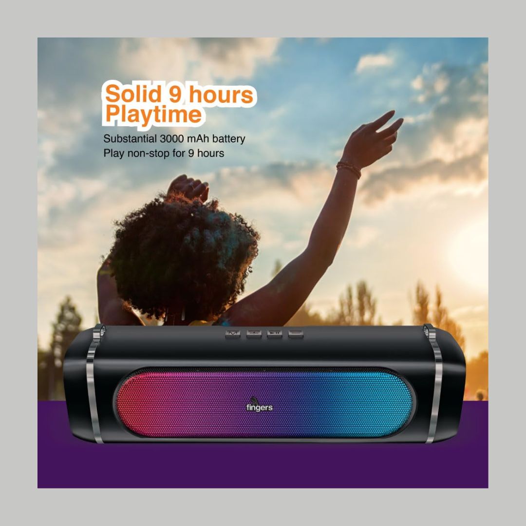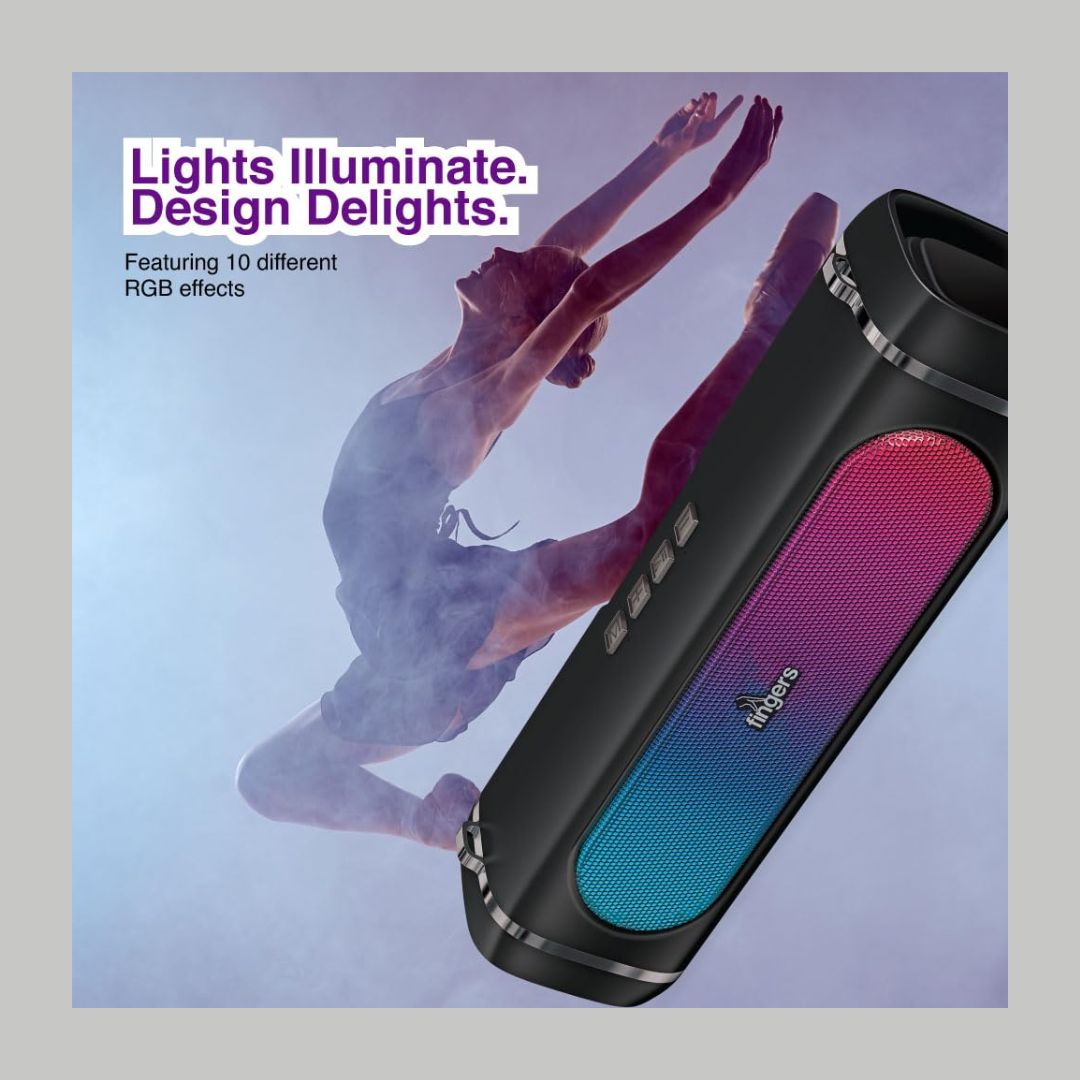 The FINGERS SoundPower-20 is a sleek and portable Bluetooth speaker offering an immersive 20W deep bass experience with dual full-range drivers. Featuring RGB lights with 10 dynamic effects synchronized to your music, it enhances any setting with a lively ambiance. Powered by a 3000mAh battery, it delivers up to 9 hours of non-stop playback and supports versatile playback modes, including Bluetooth, FM Radio, USB, AUX, and MicroSD. With its built-in microphone for clear calls and multi-point connectivity for two devices, it's perfect for any occasion. Lightweight and travel-friendly, it includes a carry strap for easy portability.