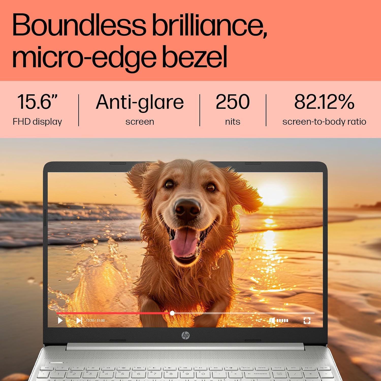 Equipped with 8GB DDR4 RAM and a fast 512GB PCIe NVMe M.2 SSD, the HP 15s offers quick boot times, seamless application performance, and ample storage for files, documents, and media. The 15.6-inch Full HD micro-edge display features 250 nits brightness and an anti-glare panel, delivering sharp images and a comfortable viewing experience, even during long working hours.