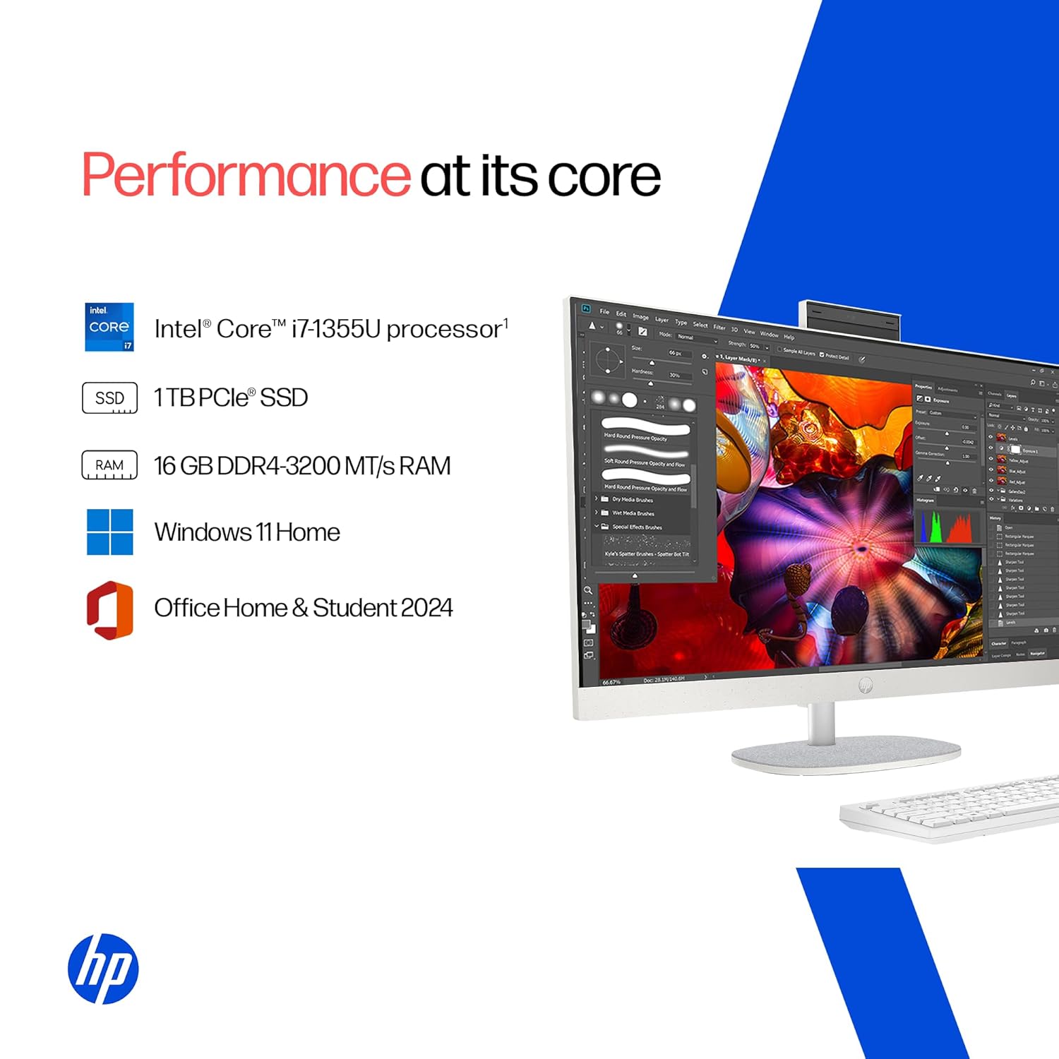 HP 27-cr0406in All-in-One Desktop PC is designed to deliver powerful performance and a clean workspace for modern professionals and home users. Powered by a 13th Gen Intel Core i7-1355U processor with up to 5.0 GHz turbo boost and paired with 16GB DDR4 RAM, it ensures smooth multitasking for office work, content creation and everyday productivity. The 1TB PCIe NVMe SSD provides fast boot times and ample storage for applications, documents and media files.