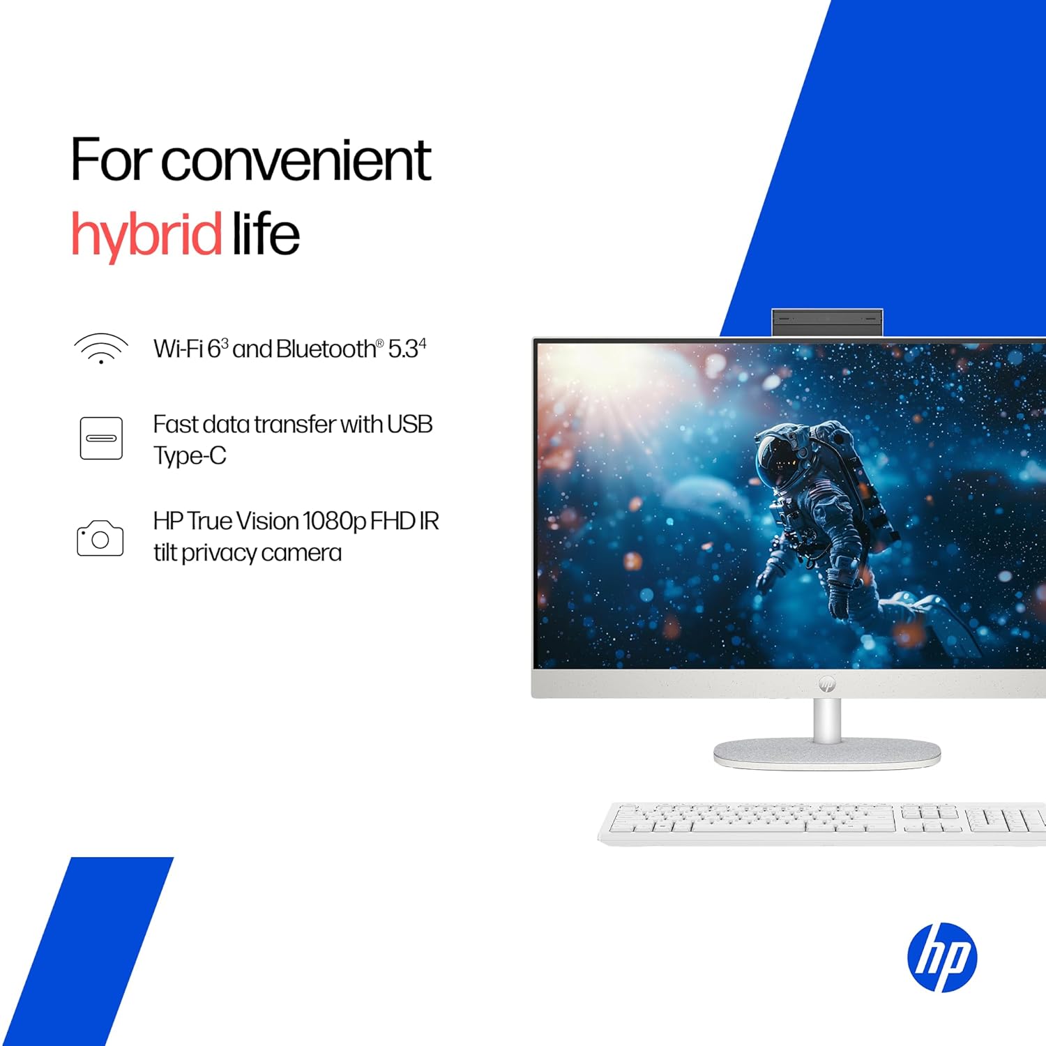 This all-in-one PC features a large 27-inch Full HD IPS display with a three-sided micro-edge design that offers immersive visuals and wide viewing angles. The anti-glare panel with 300 nits brightness and 99% sRGB coverage ensures vibrant and comfortable viewing. Equipped with Wi-Fi 6 connectivity, an HP True Vision 1080p IR camera, dual speakers and a wireless keyboard and mouse combo, the HP 27-cr0406in delivers a complete and efficient desktop computing experience.