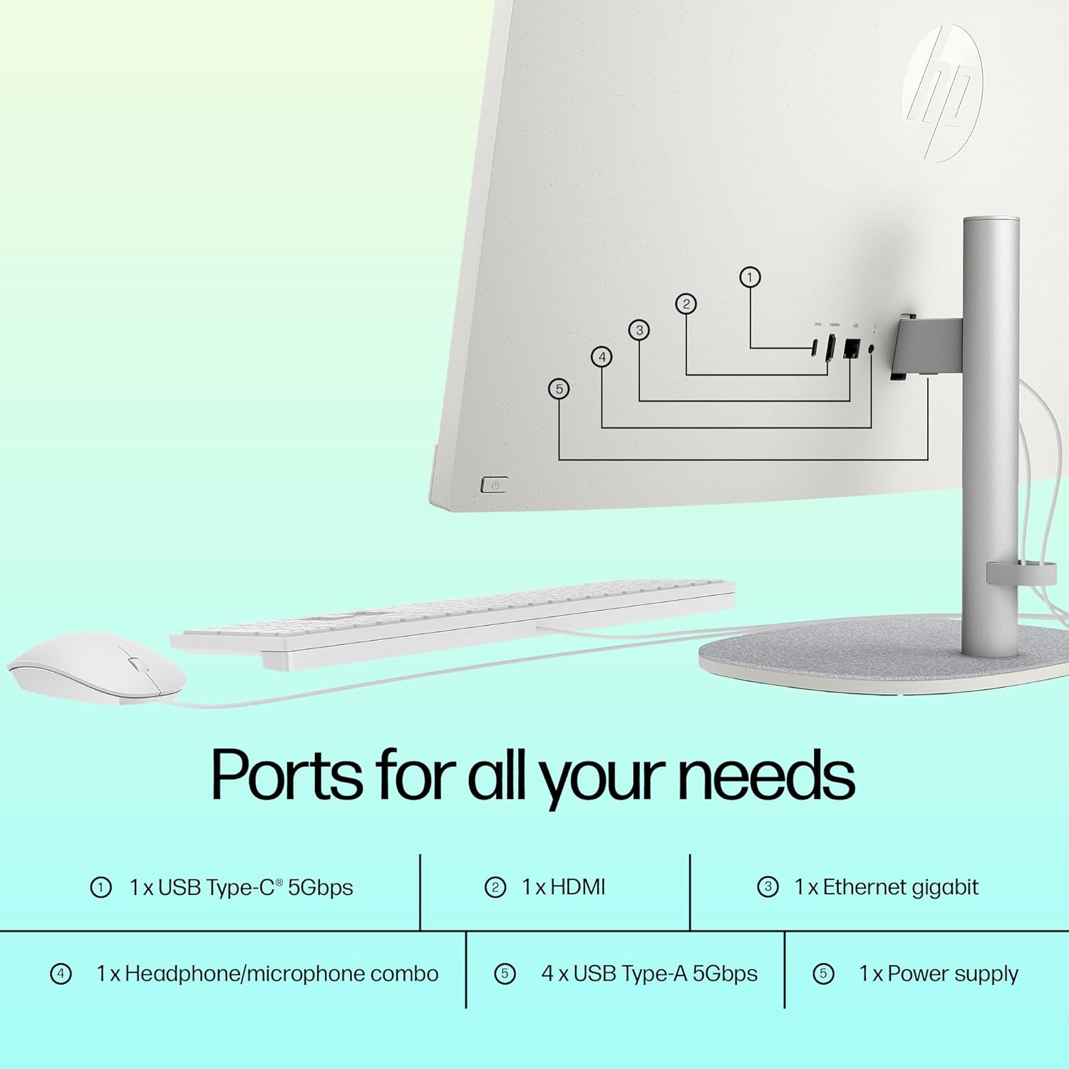 The 27-inch Full HD IPS display offers vibrant visuals with anti-glare coating and 300 nits brightness, ideal for work and play. Designed in a sleek Shell White finish, this PC complements modern workspaces while maintaining minimal desktop clutter. It also features a FHD IR tilt camera with a privacy shutter, ensuring secure and high-quality video calls.