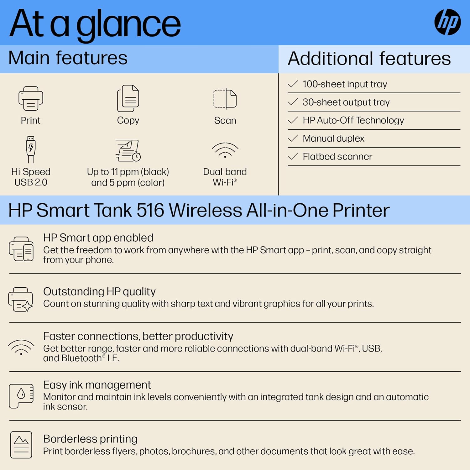 Perfect for users who demand high-volume, cost-effective, and versatile printing, the HP Ink Tank 516 is a reliable choice for all your printing, scanning, and copying needs.