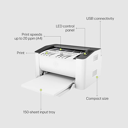 | Included Components | Preinstalled introductory HP Laser Black print cartridges (~1.5K pages); Setup Guide; Reference Guide; Regulatory Statements Flyer; Power cord; USB cable |