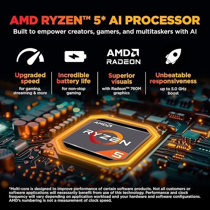 | Processor | 8th Gen AMD Ryzen 5 8645HS, 6 x 4.3 GHz (Turbo up to 5 GHz), Hexa Core, 12 Threads, 16 MB Cache |