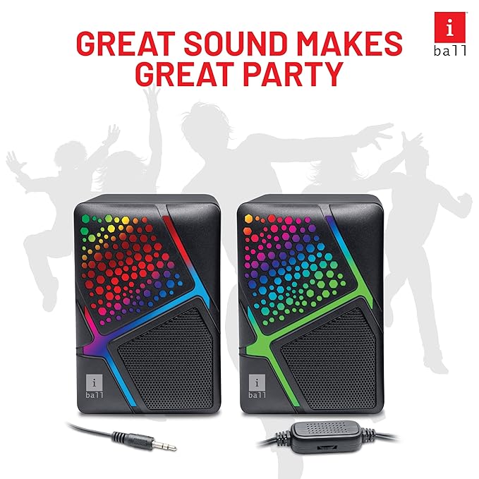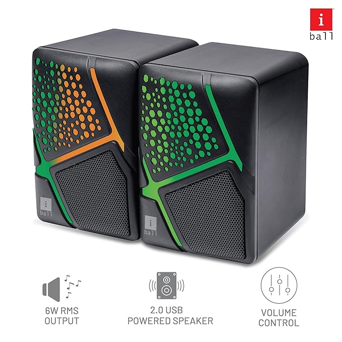 iBall Disco 18 RGB Speaker: 2.0 USB-powered gaming multimedia speaker with 6W RMS stereo sound and dynamic bass. Features vibrant RGB LED lights for an immersive experience and a 3.5mm aux input for easy connectivity to laptops, PCs, and smartphones. Includes a volume control for convenient sound adjustment. Perfect for gaming and parties.