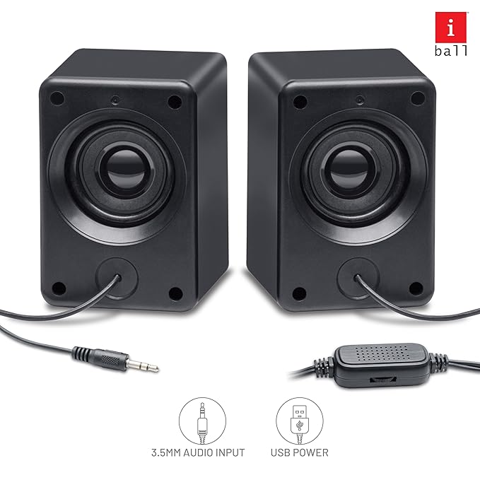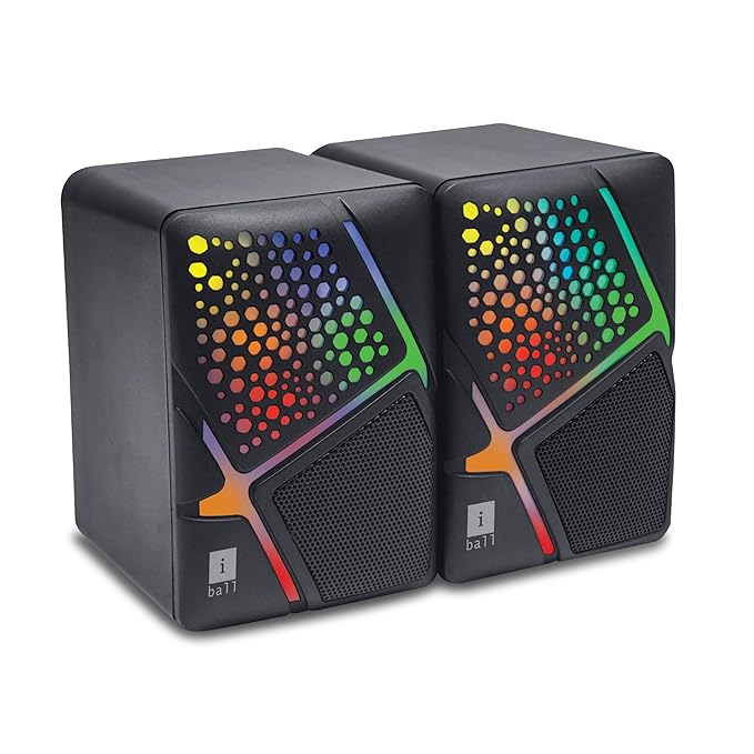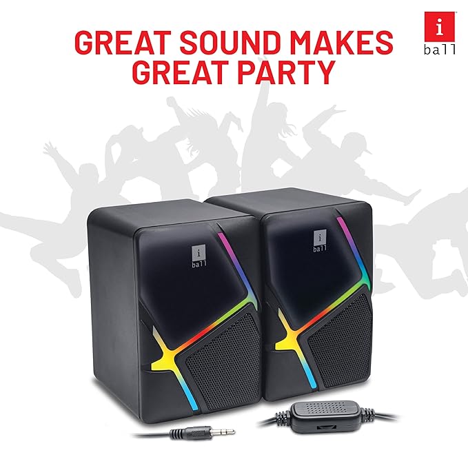 iBall Disco 9 RGB Speaker: 2.0 multimedia USB-powered speaker with 6W RMS stereo sound, dynamic bass, and colorful RGB LED lights. Features a 3.5mm aux input for compatibility with laptops, PCs, and smartphones. Includes volume control for easy sound adjustment. Ideal for parties and gaming setups.