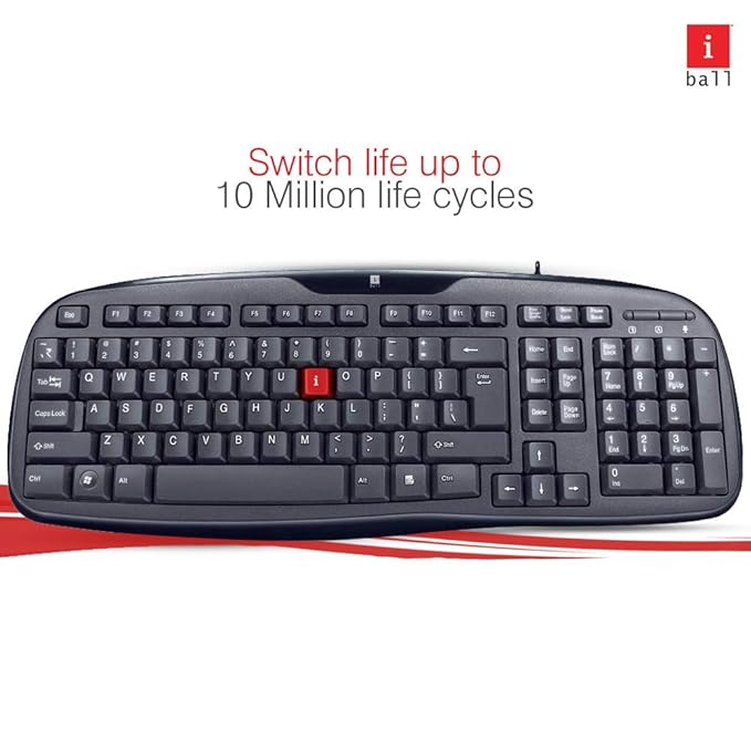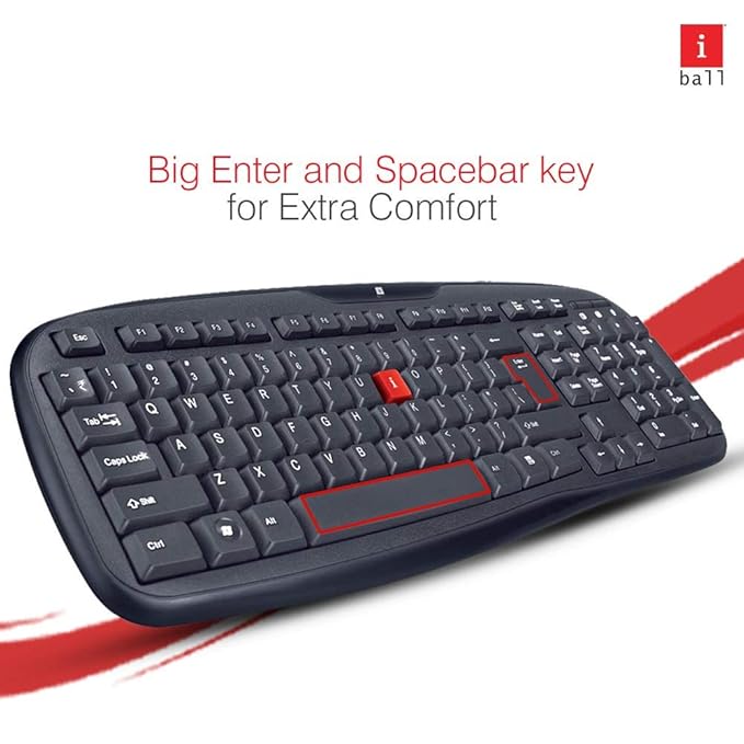 iBall Winner USB V2.0 Keyboard features 103 soft-feel keys, ensuring a comfortable typing experience for everyday use. This wired keyboard is compatible with Windows and designed for speedy work. It is water-resistant with a sealed membrane sheet for added durability, featuring large Enter, Backspace, and Space Bar keys to reduce typing errors. The keyboard offers a 10 million switch life, backed by a 3-year warranty. With dimensions of 16.8 x 44.8 x 2.5 cm and a weight of 452 grams, it's a reliable choice for any workspace.