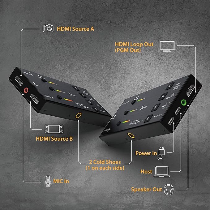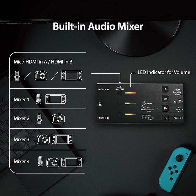 Built-in audio mixing lets you toggle between three channels (HDMI™ A, HDMI™ B, Mic) in real-time. With volume indicators, a dedicated mic-in port, and speaker output, the JVA06 gives you total control over your stream.