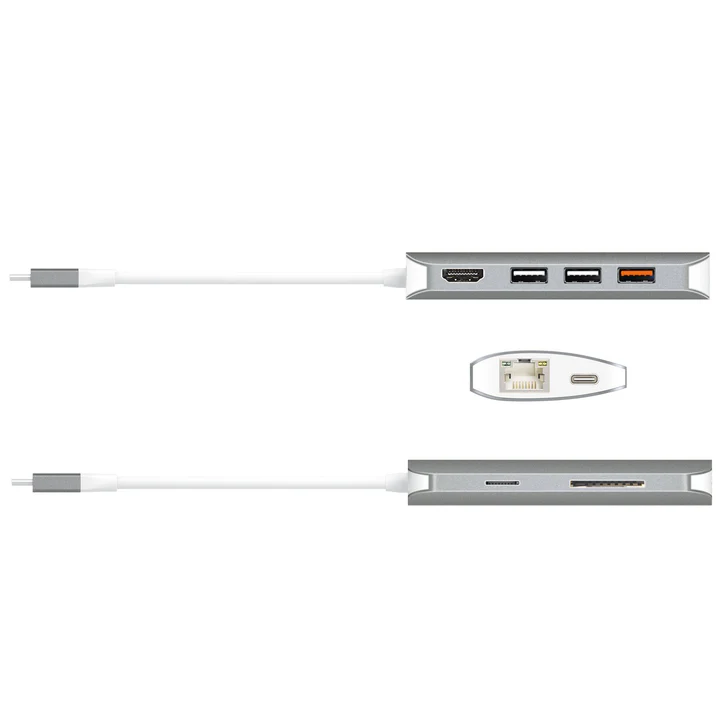 | Hardware | 1× USB-C Male (host), 2× USB-A 3.1 Gen 1, 1× USB-A 3.1 Gen 1 (BC 1.2), 1× USB-C 3.0 (PD 3.0 & Data), 1× SD & microSD, 1× 4K HDMI, 1× RJ45 (Gigabit Ethernet) |
