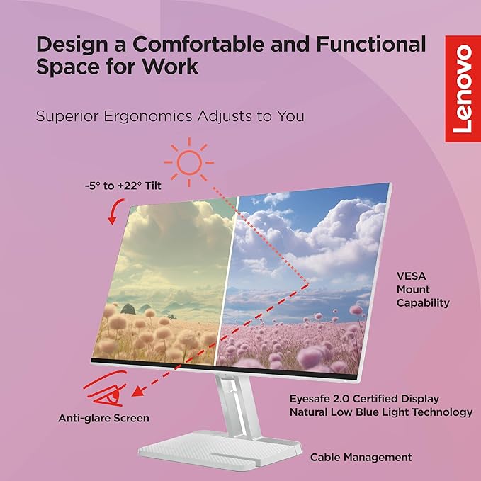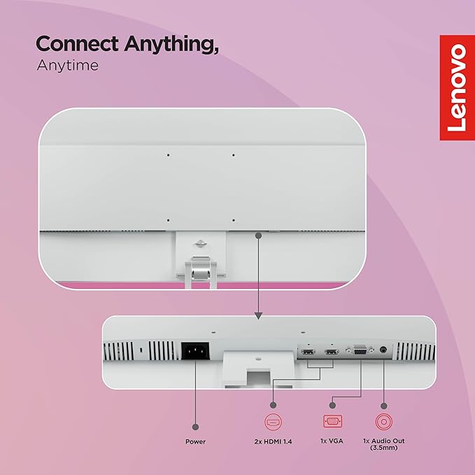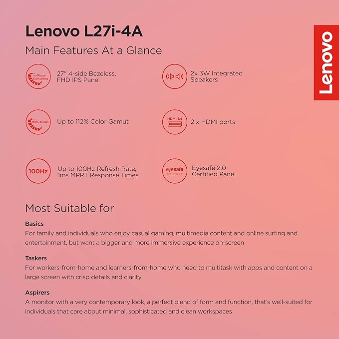 The Lenovo L27i-4A is a 27-inch FHD IPS monitor offering a 100Hz refresh rate and 1ms response time, perfect for work and light gaming. With 99% sRGB color coverage and vivid 16.7 million colors, it delivers an immersive visual experience. The ultra-slim design features integrated cable management and a phone holder for convenience. Connectivity options include 2x HDMI 1.4 and 1x VGA. Built-in 3W speakers provide clear audio, while Lenovo's Artery software allows easy customization for multitasking. With Natural Low Blue Light technology, it ensures eye comfort during extended use. Backed by a 3-year warranty, it's a versatile and reliable choice.