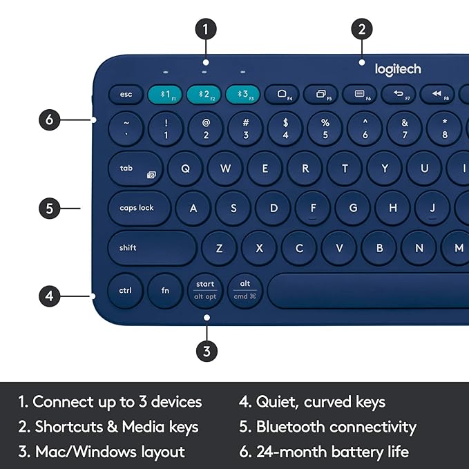 The Logitech K380 Wireless Multi-Device Keyboard is a versatile, compact, and stylish solution for seamless typing across multiple devices. Designed to work with Windows, macOS, iOS, Android, Apple TV, and ChromeOS, it connects via Bluetooth, offering the convenience of switching between up to three devices with easy-switch buttons. Its compact, space-saving design is perfect for on-the-go use, while its rounded keys ensure a comfortable and quiet typing experience. Ideal for PCs, Macs, laptops, smartphones, or tablets, the K380 delivers reliable performance in a sleek blue finish.