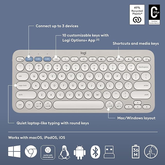 The Logitech Pebble 2 Combo in Tonal Sand is a sleek and modern wireless keyboard and mouse set designed for both style and functionality. With a slim, lightweight build, it’s easy to carry and perfect for on-the-go productivity. The keyboard and mouse deliver ultra-quiet typing and clicking, making them ideal for shared spaces and focused work environments. Featuring dual connectivity with Logi Bolt and Bluetooth, you can easily switch between devices including Windows, macOS, iPadOS, and ChromeOS. The combo also offers customisable keys for personalised shortcuts, ensuring a smooth and efficient workflow while complementing your workspace with its elegant, neutral design.
