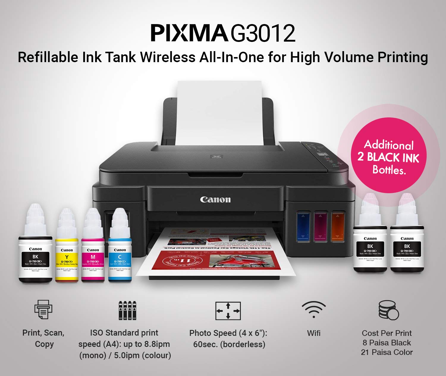 The Canon Pixma G3012 is an all-in-one wireless ink tank printer designed for home and small office use. It supports print, scan, and copy functions with Wi-Fi and USB connectivity for flexible operation. With a high print resolution of 4800 x 1200 dpi, it delivers sharp text and vibrant colour prints.