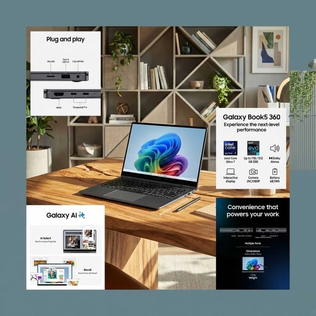 The Samsung Galaxy Book 5 Pro 360 16-inch NP960QHA-KG3IN is a powerful and versatile 2-in-1 laptop designed for professionals and creators. Powered by the Intel Core Ultra 5 226V 15th Gen processor, it delivers efficient performance with advanced AI computing capabilities. With 16GB DDR5 RAM and a fast 512GB SSD, this laptop ensures smooth multitasking and quick access to files and applications.