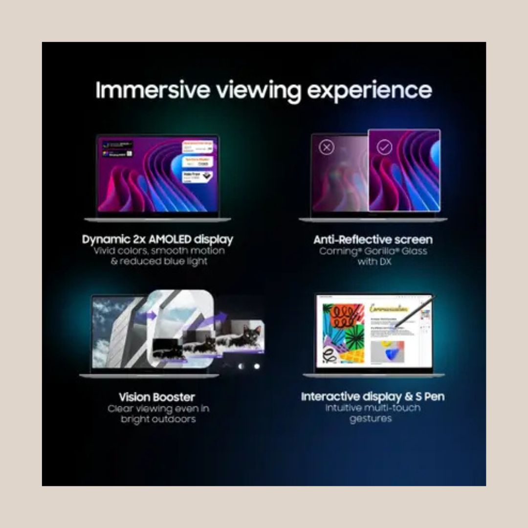 Its large 16-inch AMOLED touchscreen delivers stunning visuals with deep blacks and vibrant colors, ideal for creative work, presentations, and entertainment. The 360-degree convertible hinge allows flexible use in laptop, tablet, and presentation modes, while S Pen support enhances precision for note-taking and design tasks. Built with a premium metal body and weighing just 1. 66 kg, it balances durability with portability. Features like a backlit keyboard, fingerprint reader, Windows 11 Home, and MS Office make it a complete productivity solution.