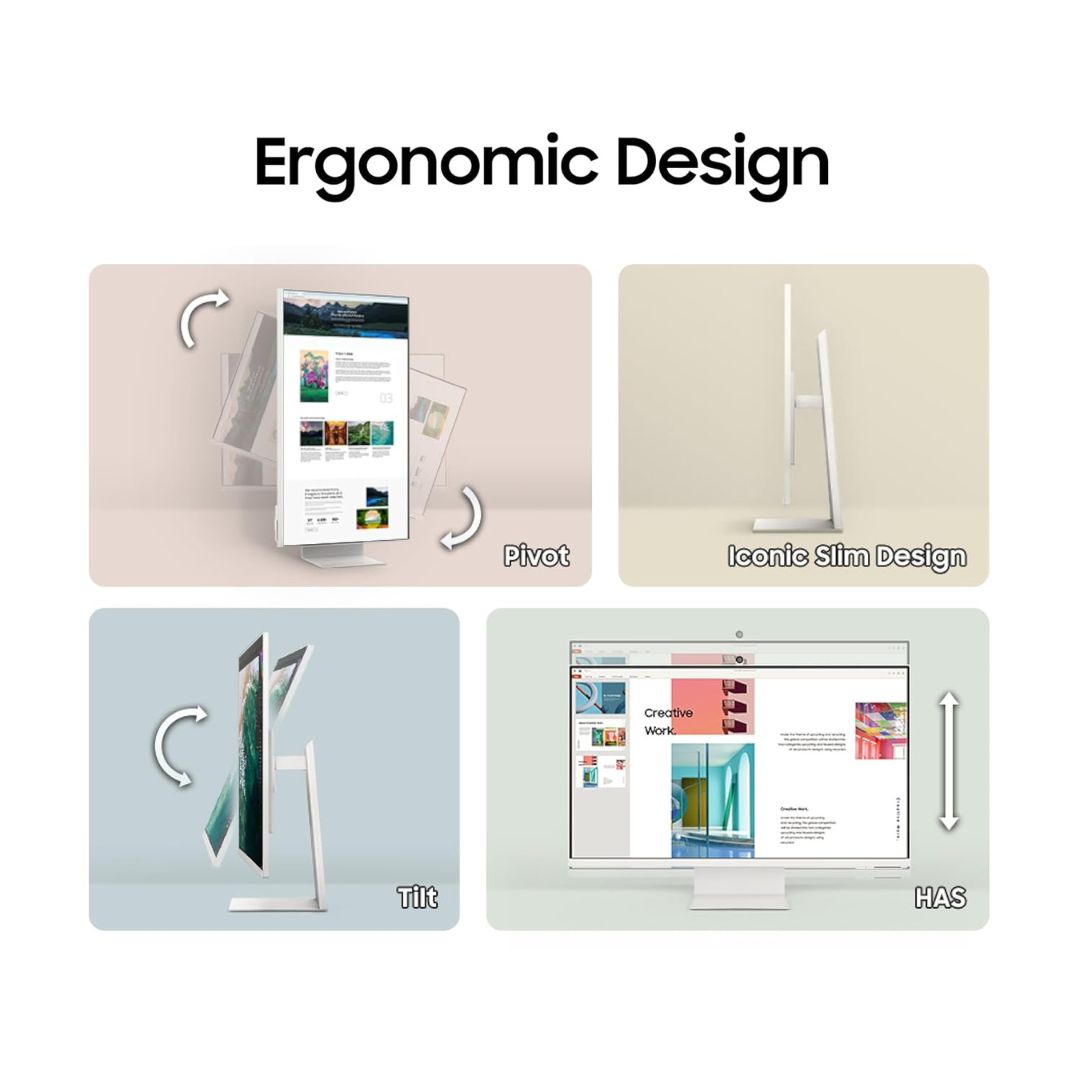 Finished in an elegant white design, the Samsung M7 Smart Monitor is ideal for modern homes and smart workspaces.
