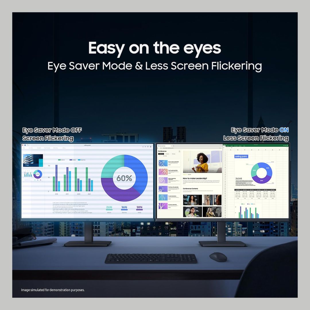 Designed for comfort, the monitor features Eye Saver Mode to minimize eye strain during long working hours. The super-slim, borderless design adds a premium look and makes it ideal for multi-monitor setups. Equipped with HDMI and VGA ports and VESA wall mount support, the Samsung S3 monitor fits seamlessly into any home or office workspace.