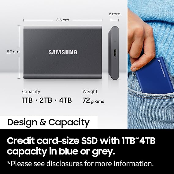 The Samsung T7 2TB Portable SSD offers blazing-fast data transfer speeds of up to 1,050MB/s with USB 3.2 Gen 2 (10Gbps) support and a USB Type-C interface, making it perfect for transferring large files, videos, or backing up data in seconds. Built with NVMe technology, this ultra-compact SSD delivers performance and portability in a sleek, durable metal enclosure.