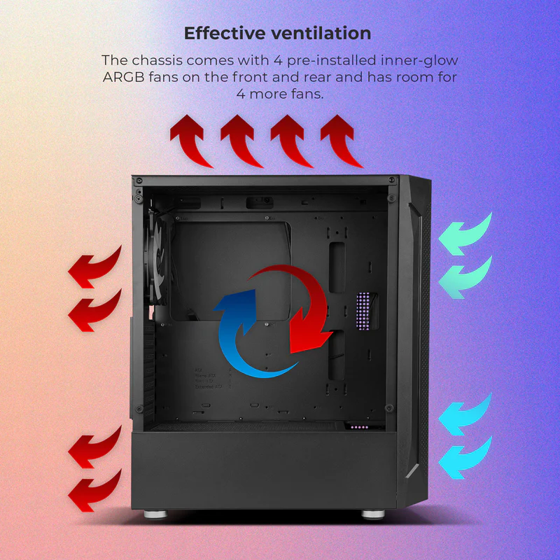It comes equipped with 4 pre-installed ARGB fans that deliver vibrant lighting effects while ensuring efficient cooling during intense gaming sessions. The tempered glass side panel not only adds durability but also lets you showcase your premium components in style.