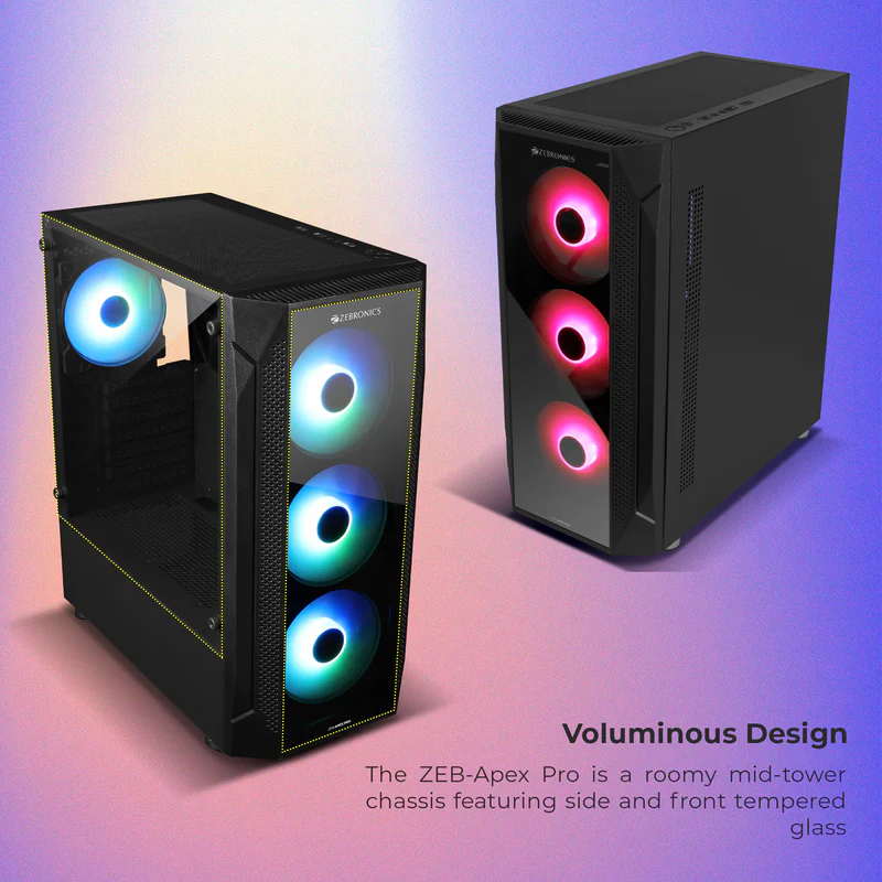 The front I/O panel includes USB 3.0, USB 2.0, audio, and mic ports, providing fast connectivity and convenience. With its sleek design, sturdy build quality, and premium features, the Zebronics Apex Pro is a perfect choice for gamers, creators, and professionals who want a future-ready gaming cabinet.
