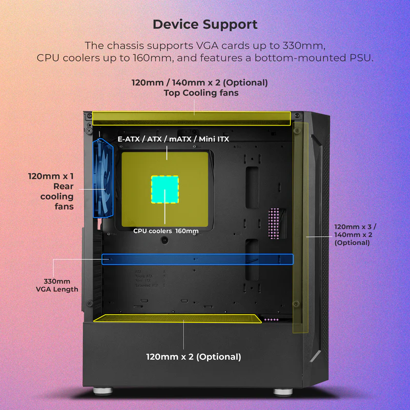 | Cooling Support | AIO Liquid Cooling up to 360mm, Multiple Fan Mounts |