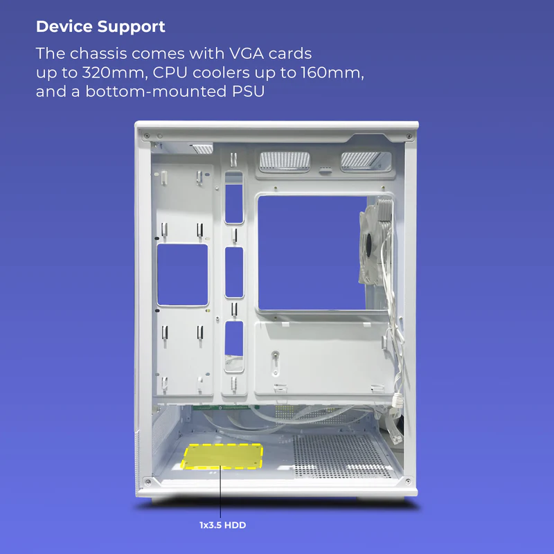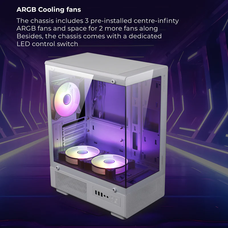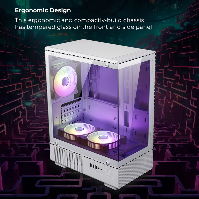 The Zebronics Maximus Gaming Mid Tower Cabinet is designed to deliver both performance and style for your gaming setup. Built with a sturdy steel frame and a sleek WHITE finish, this cabinet offers durability along with a modern look that complements any gaming desk.