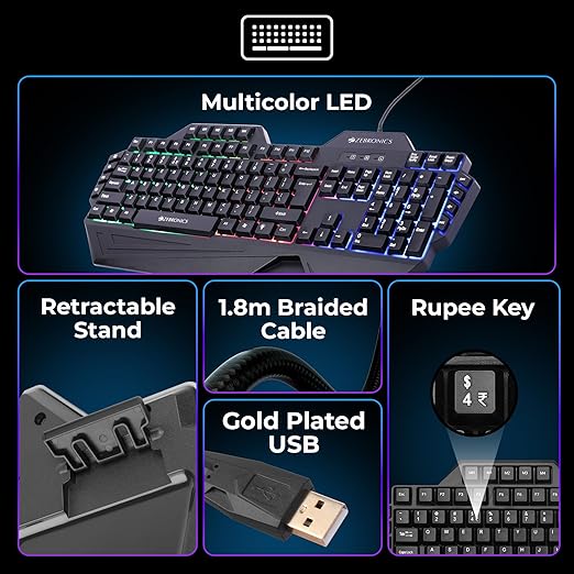 The Zebronics Optimus Gaming Keyboard & Mouse Combo is designed for gamers who want performance, durability, and style in one package. The full-size keyboard comes with 117 keys including dedicated macro keys, giving you complete control for gaming and productivity. Its multicolor LED backlighting adds a vibrant look to your setup, while the braided cable with gold-plated USB ensures long-lasting durability and stable connectivity.