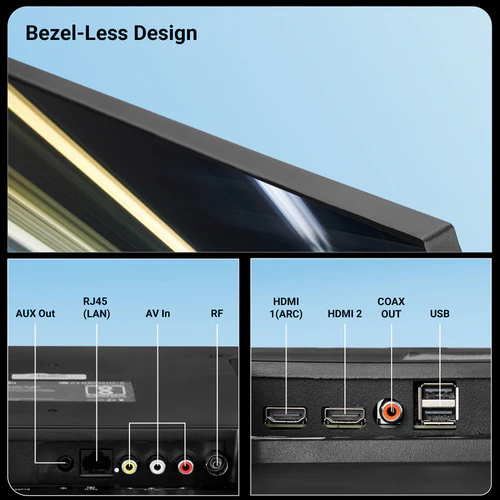 A: It offers versatile connectivity: 2× HDMI (including ARC), 2× USB, AV‑IN, AUX‑OUT, coaxial digital audio out, and an RJ45 Ethernet port. Built‑in Wi‑Fi allows full wireless smart functionality .