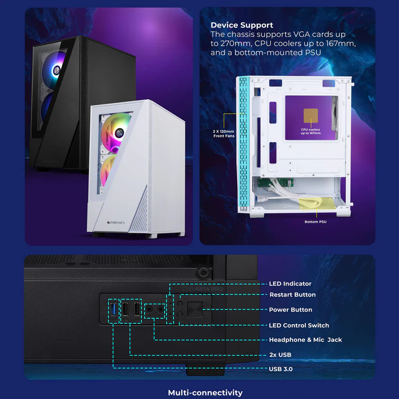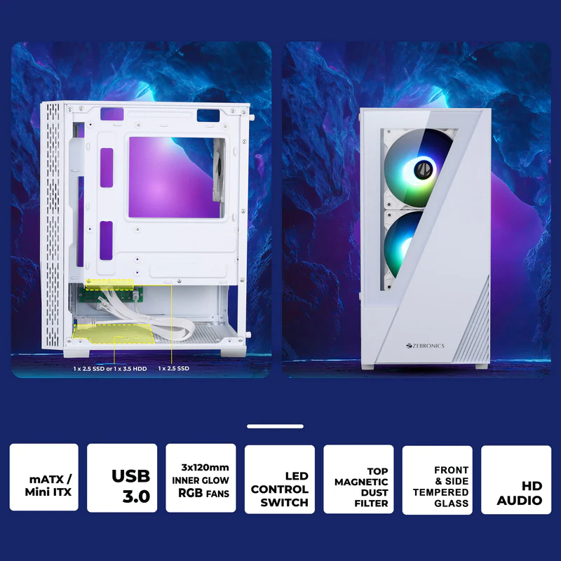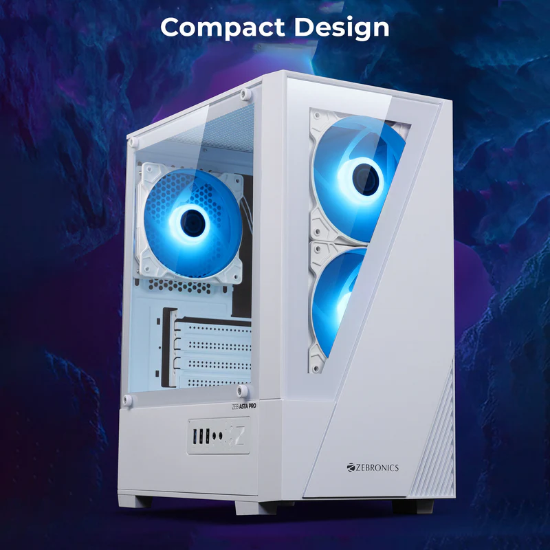 With its sleek white finish, multiple drive bays, and expansion slots, the Zeb Asta Pro offers the perfect balance of functionality, style, and durability — making it an ideal choice for gamers and PC builders.