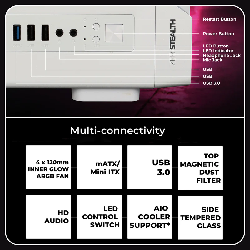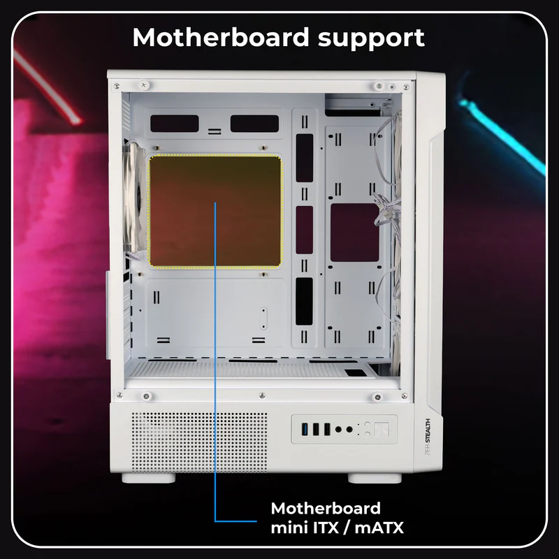 The Zebronics Zeb Stealth is a stylish and compact mini-tower gaming chassis designed for performance-focused mATX and Mini ITX builds. It comes equipped with four ARGB fans (three in the front, one at the back) and a tempered glass side panel, providing both strong airflow and stunning visual appeal.