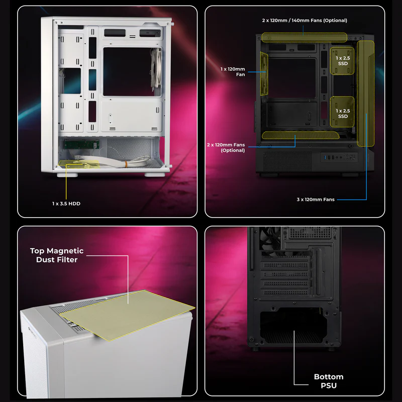 | Pre-installed Fans | 3 × 120 mm ARGB (Front), 1 × 120 mm ARGB (Rear) |
