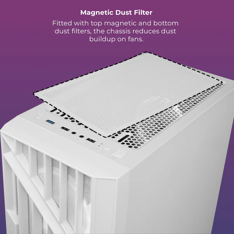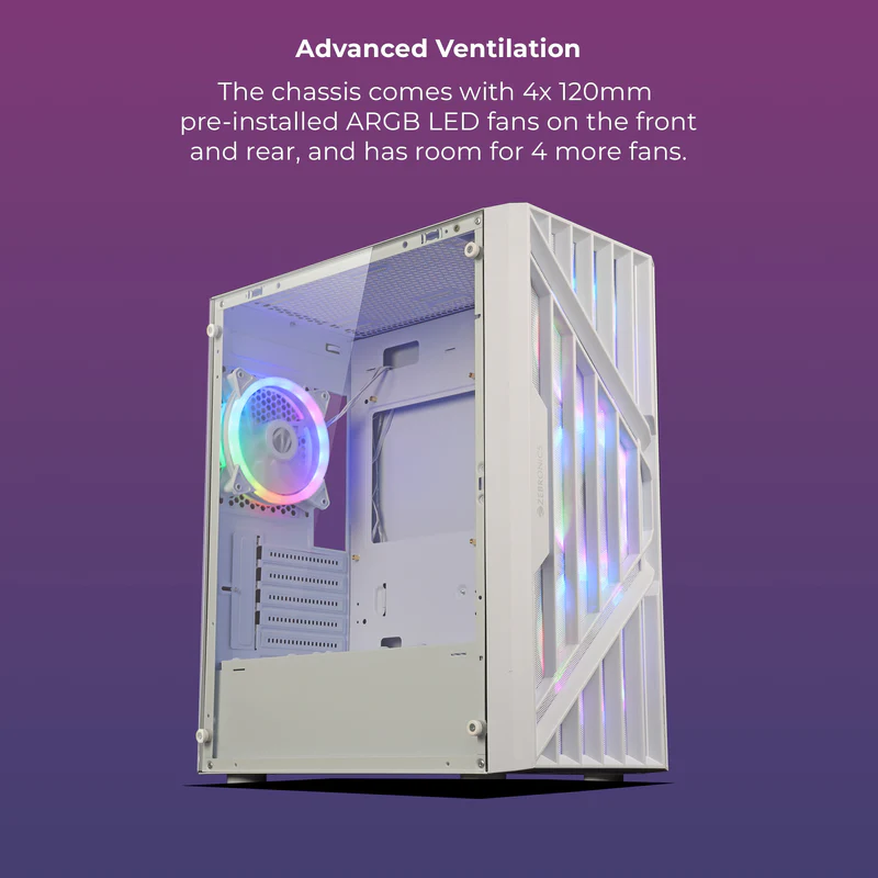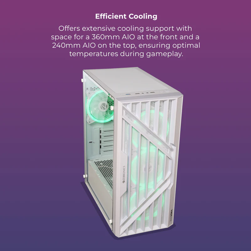 The Zebronics ZEB-Voxa White is a high-performance gaming cabinet designed for gamers who demand both power and style. Built with a heavy-duty metal chassis, this cabinet provides a strong, stable structure capable of holding high-end components with ease. Its high-airflow mesh front panel ensures exceptional ventilation, keeping your system cool even during intense gaming sessions or long hours of productivity.