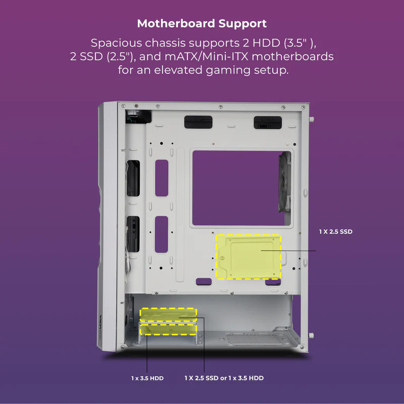 Inside, the cabinet offers spacious room for powerful GPUs, multiple storage drives (SSD + HDD), and various cooling options, including multiple fan mounts and liquid cooling support. Whether you're building a budget gaming PC or a high-end performance machine, the ZEB-Voxa gives you the flexibility you need.